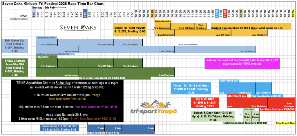 - 11.25am Try-a-tri and Youth Tri compulsory race briefing